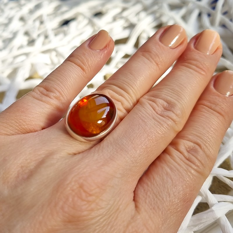 Beautiful and unique amber ring with shiny cognac Baltic amber. This sterling silver ring was created in Amber Pol's workshop in Sopot.