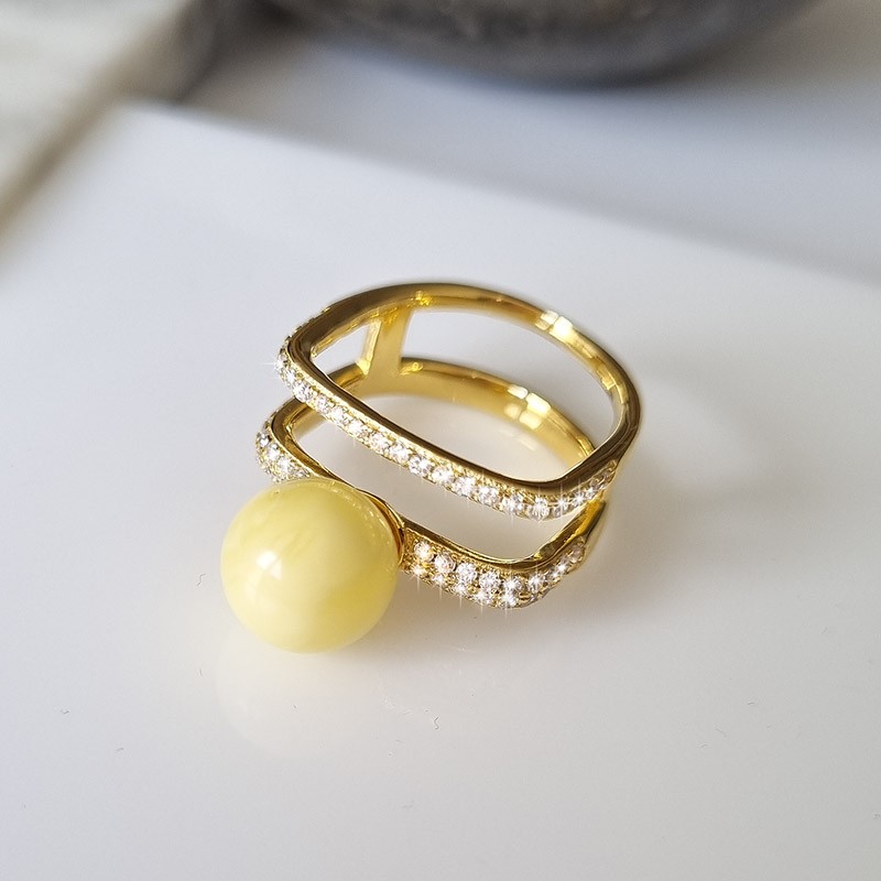 Fashionable gold plated sterling silver ring with zirconia and beautiful milky amber. For all fashionistas!