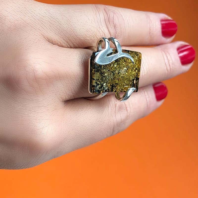 Modern amber ring in a beautiful green colour. Made with 925 sterling silver in our workshop in Sopot.