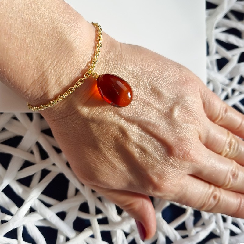 Fashionable gold plated sterling silver bracelet with beautiful cherry amber. Ideal to your autumn outfits.