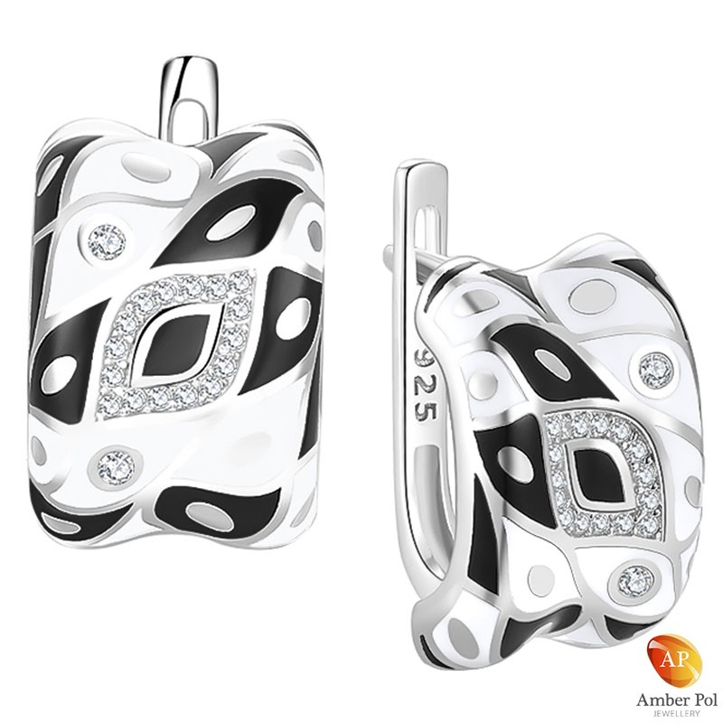 Beautiful hand painted enamel earrings with zirconia in white and black.