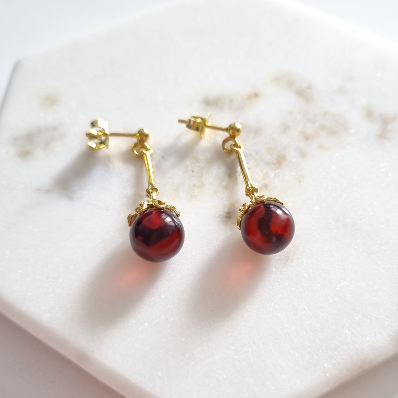 Fashionable gold plated sterling silver earrings with beautiful cherry amber. Ideal to your autumn outfits.