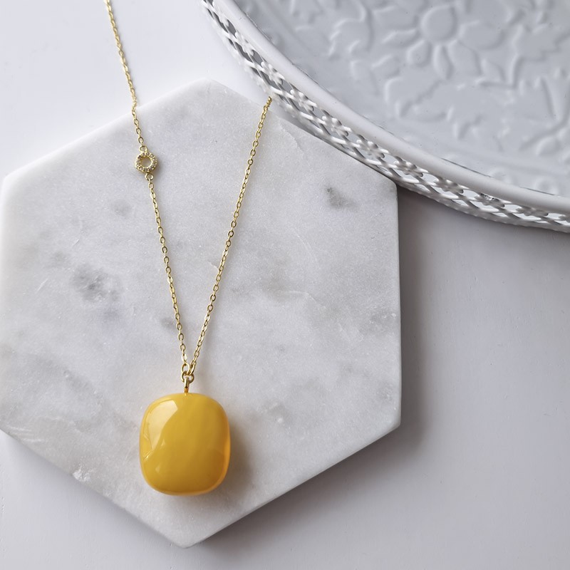 24k gold plated sterling silver necklace with zirconia and beautiful milky amber in a perfectly regular shape.