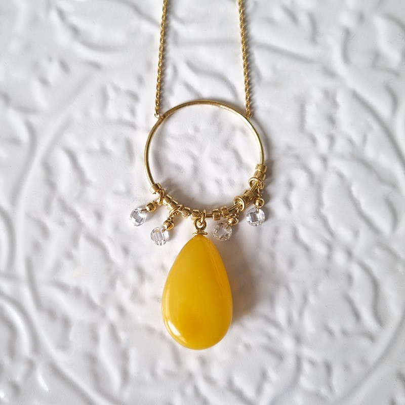 Piękny naszyjnik boho z bursztynem i cyrkoniami wykonany ze srebra próby 925 pozłacany 24-karatowym złotem. Super dodatek do Twoich stylizacji w stylu boho.