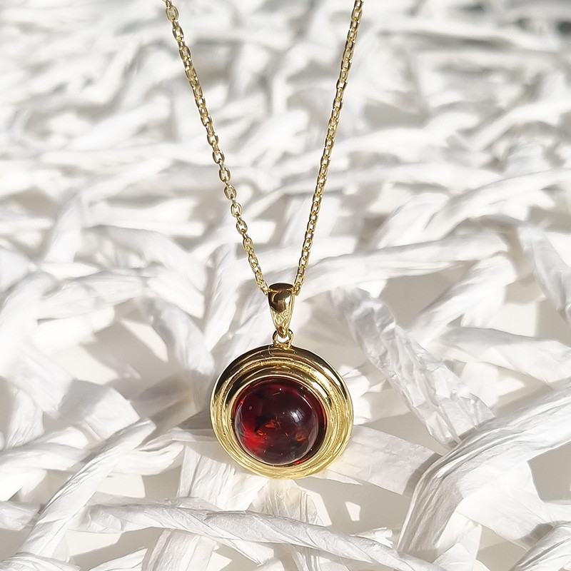 Modny naszyjnik z bursztynem wykonany ze srebra próby 925 pozłacany 24-karatowym złotem.