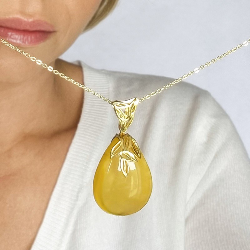 Modny naszyjnik z bursztynem wykonany ze srebra próby 925 pozłacany 24-karatowym złotem.