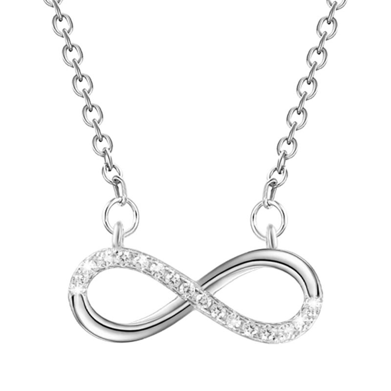 Modny naszyjnik celebrytka nieskończoność z cyrkoniami na delikatnym łańcuszku wykonany ze srebra próby 925.